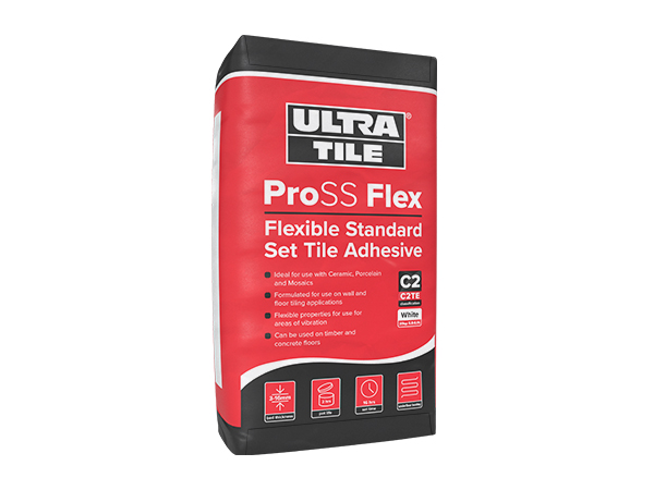 UltraTile ProSS Flex is a single part, standard set, flexible adhesive for wall and floor tiles. It is specially formulated with enhanced adhesion and flexibility for use with ceramic, porcelain and natural stone tiles. UltraTile ProSS Flex is a polymer modified adhesive suitable for use with most common substrates and in areas of movement and vibration.